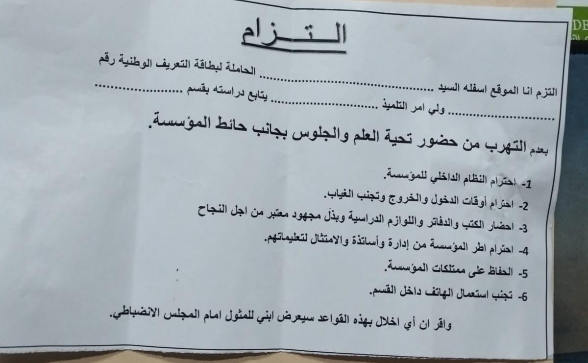 أقدمت الإدارة التربوية للثانويـــة التأهيلية البروج على طرد مجموعــة من التلاميــذ صبيحة يوم الاثنين 13 اكتوبر 2025 بحجة التأخـــر عن الحضور لتحية العلم الوطني، بعد أن تأخرت وسائل النقل التي تقلهم من القرى و المداشر التابعة لدائرة البروج. وحرمان التلميذات و التلاميذ من متابعة الدراسة بالحصة الأولى و رميهم خارج أسوار المؤسسة التعليمية من بينهم فتيات، ودعوتهم لإحضار إبائهم وأوليائهم إلى الإدارة. و بعدها وزعت التزام على مجموعة من التلاميذ كالت فيه سيل من التهم للتلاميذ بتهم لم يقترفوها ودعت الأباء الى المصادقة عليه و تهديدهم بالمثول على مجلس الانضباط كفزاعة لطردهم من التمدرس.